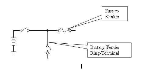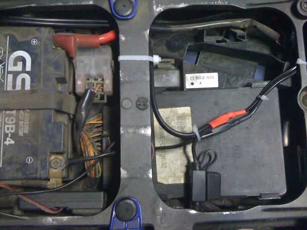 He utilizado el grifo de la línea media y algunos repuesto cable eléctrico (puede utilizar algunos de la Deltran 12' extensión) para conectar el lado positivo del cable Deltran batería anillo entre el interruptor y el fusible de la luz intermitente, el Deltran batería cable tiene en línea su propio fusible por lo que con esta configuración no aumentará la carga del fusible luz intermitente (yo escogí la luz intermitente porque es no vital y fluctuación del voltaje de las luces es despreciable) , para mi esta parte fue un poco complicado debido a la ubicación de la caja de fusibles en un lugar apretado debajo del tanque. Conecte el otro cable directamente al borne negativo de la batería. Originalmente cambialo hasta cargar un teléfono bajo asiento trasero entonces pero entonces tengo esta bolsa sobre depósito magnética (esto es donde entra el cable de extensión).