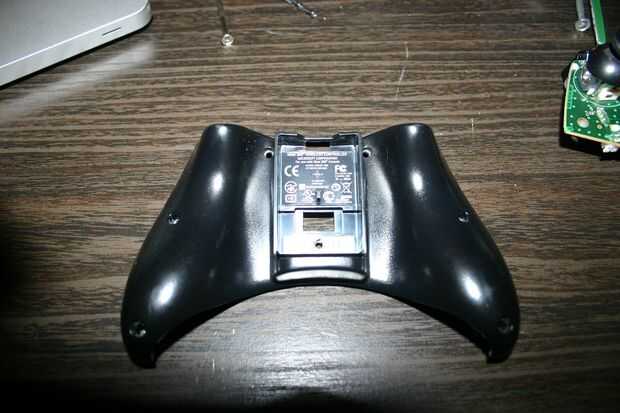 Una vez que los tornillos están fuera extraer la parte superior la mitad del controlador mientras que los botones se enfrentan a la tierra. Esto evitará que los botones cayendo por todo el piso. Cinta los botones hacia abajo desde la parte superior del controlador, pero va ser sacarlos temporalmente de todos modos así que me salté este.