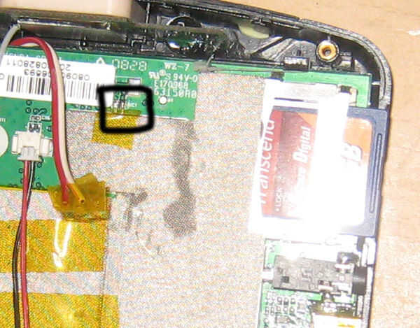 La tapa trasera tiene cuatro tornillos. Retire los y desconecte la batería y el altavoz de la placa principal. Dejar de lado la cubierta posterior. En el tablero principal, ubicar el área por debajo del receptor gps y a la izquierda de la ranura para tarjetas sd marcada "mic1" y tomar nota de las dos huellas con soldadura sobre ellos directamente a la izquierda de "mic1". Puede haber allí una pegatina que tienes que pelar apagado.