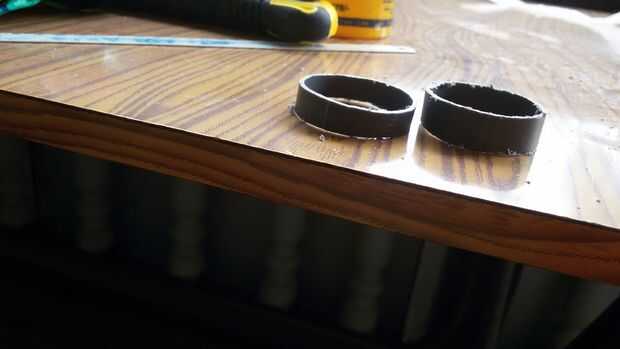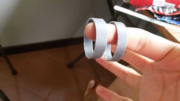 Sierra dos lazos de igual grueso de la longitud de la tubería. Testimonio de mis habilidades excelentes de la sierras, en el primero tuve lazos de dos espesores muy diferentes xD pero si eres tan hábil como soy, no te preocupes. Usa el cuchillo para hacer la diferencia en anchura hasta algo menos notable, como se ve en la foto 2. Usted puede hacer esto pelar a lo largo de los bordes de cada lazo con el cuchillo.