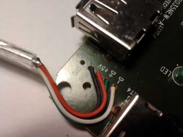 Si el hub USB ya no tiene agujeros para el conector, buscar el cable USB y encontrar las pistas de VCC(red wire) y GND(black wire). Soldar un cable a cada uno de ellos. Si se trata de una sola cara tarjeta incluso puede perforar algunos agujeros en las pistas para la soldadura de los cables o un conector.