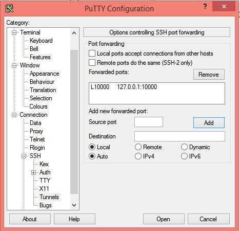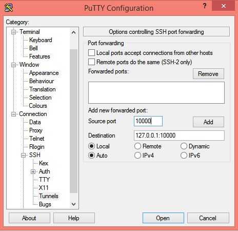 En el menú de la derecha, abrir la "Conexión", "SSH" y haga clic en "Túneles". En la casilla que dice tipo "Source Port" "10000". En la casilla que dice "Destino", escriba "127.0.0.1:10000". Asegúrese de que se seleccionan los botones de radio "Local" y "Auto". Haga clic en el botón "Añadir". La nueva conexión debe aparecer en el cuadro de "Puertos reenviados" como se muestra.