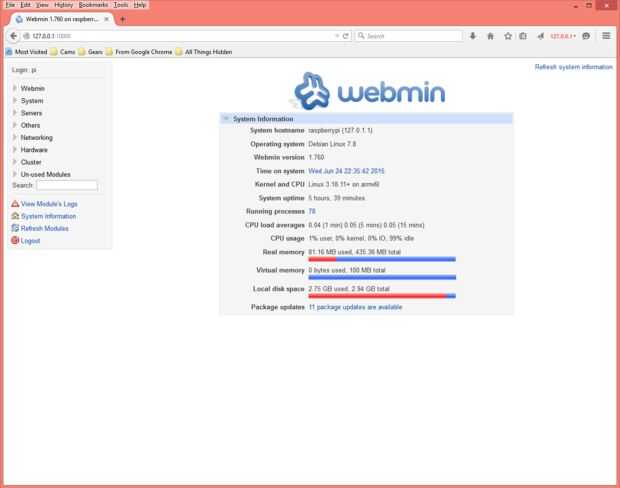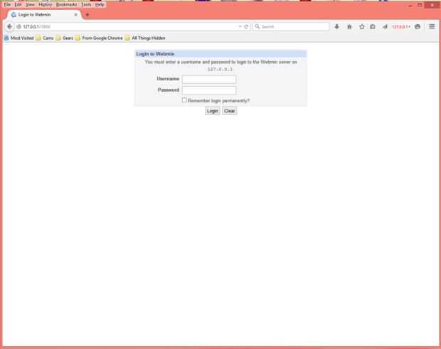 Masilla de ahora ha creado una conexión que aparece en el extremo de la Raspberry Pi para originar dentro de la Pi. Se asigna a un puerto en el equipo al que también aparece dentro de la computadora. Esta conexión es segura y encriptada dentro de la conexión de SSH. Ahora para conectarse a Webmin tecleamos "http://127.0.0.1:10000" en la barra de direcciones del navegador. Ahora tenemos una conexión segura a nuestro Pi que la administre. No hay acceso a Webmin a través de cualquier puerto externo. Desde el exterior, Puerto 10000 de la Raspberry Pi está cerrado.