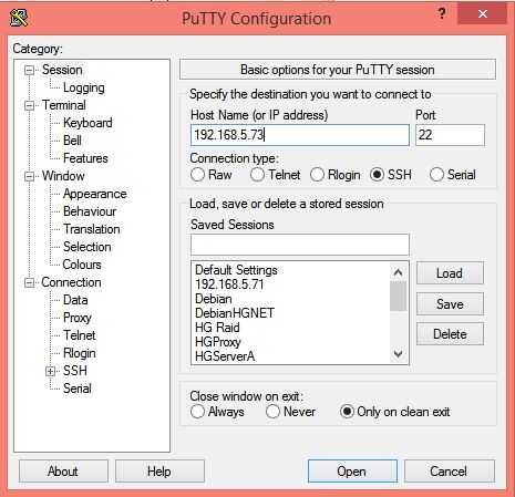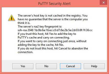 El gráfico anterior muestra masilla cuando se inicia primero. Tenga en cuenta que hemos seleccionado el botón de radio SSH y entró en 192.168.5.73 la dirección IP. Cuando hacemos clic en "Open" que la seguridad surge dice que la clave no se almacena en caché. Haga clic en "Sí" y tenemos la ventana de terminal que se muestra en el siguiente paso.