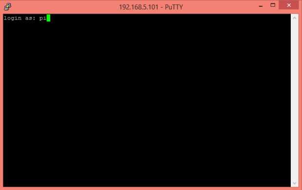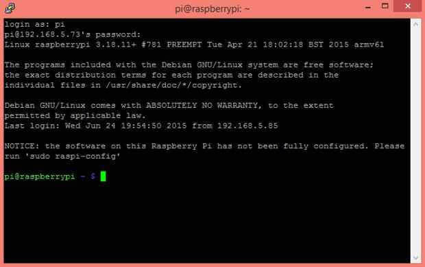 Yo ya he escrito en el usuario nombre "pi". Después de golpear, el Pi a pedir la contraseña, que es "frambuesa". Después de introducir la contraseña que tenemos una ventana de terminal con un símbolo del sistema.