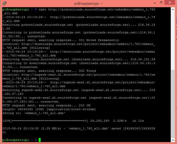 El siguiente comando descargará el archivo deb en la Pi. Uno debe usar la línea desde el enlace de Webmin para obtener la última versión.