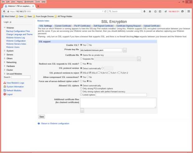 En este punto sólo mostraremos cómo configurar el túnel y para desactivar el acceso externo a Webmin. También nos caerá el SSL, ya obtenemos desde el túnel. Luego en la pantalla "Webmin Configuration", seleccionamos "SSL cifrado". En la siguiente pantalla, no elegimos el botón "" al lado de "Enable SSL?". Haga clic en el botón "Guardar". Habremos perdido nuestra conexión. Necesitamos ir a la barra de direcciones y editar "https://" "http://" y nos pondremos nuestra conexión.