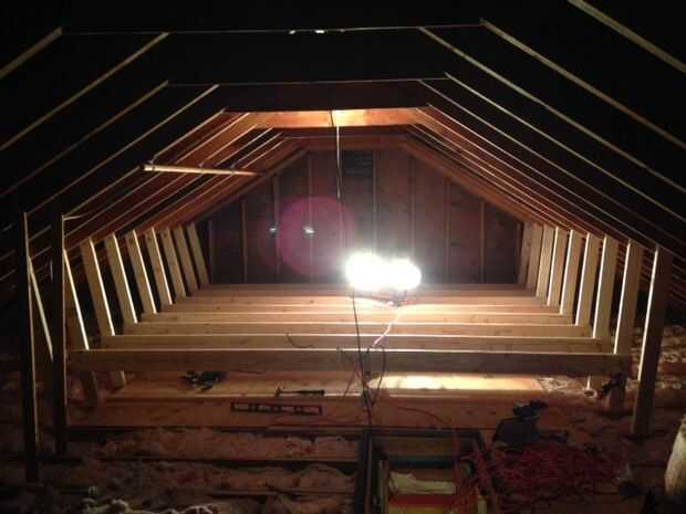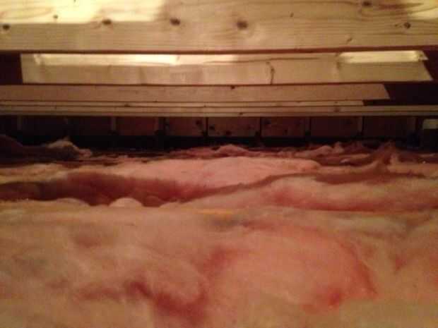 Estas fotos muestran la plataforma principal. Es un poco más de 11 pies de ancho y 10 pulgadas por encima de las vigas del piso. Habrá 8 pulgadas de aislamiento de celulosa soplada. La última foto muestra la separación entre el aislamiento de palo rosa en el piso del ático y la nueva plataforma.