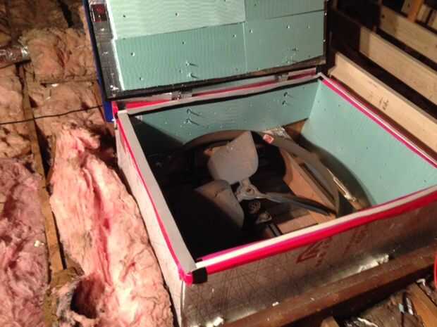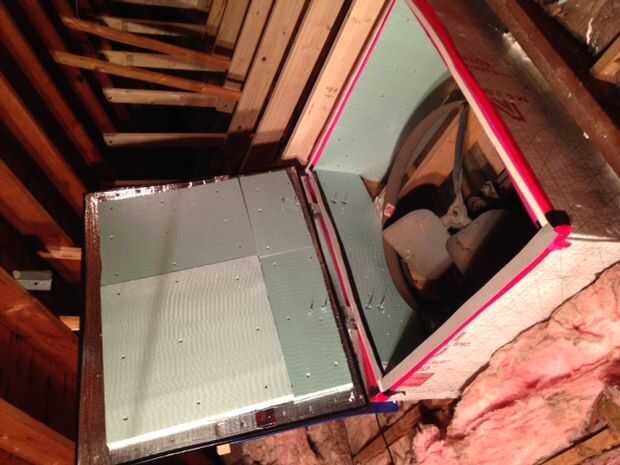 Además de la plataforma de almacenamiento que necesitaba crear escotillas aisladas para cubrir un ventilador de casa entera que usamos en el verano y un tirón hacia abajo de la escalera del ático. Utilizado madera de la capa para crear la estructura y luego tablero de aislamiento de abrigo fino de la casa que mis padres tenían de sobras y un tablero de aislamiento verde de 1 pulgada. La madera de la capa se intercala entre los 2 tipos de aislamiento. Solía tornillos de roca de hoja Coloque el tablero verde y grapas para fijar el aislamiento de plástico de casa. Usé cinta aislante metal para cubrir las juntas entre el tablero de aislamiento verde y los orificios (lo hice parte de este proceso después de tomar las fotos). Una vez que las paredes estaban aisladas utilicé spray espuma aislamiento alrededor de la parte inferior y las grietas en el interior y exterior las escotillas.