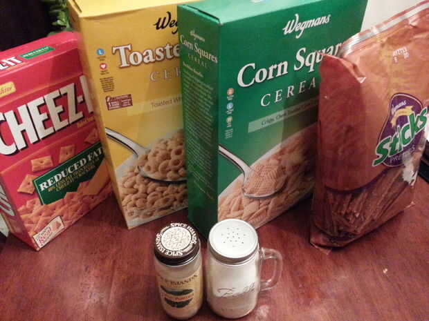 Nota: Las medidas de los ingredientes secos son aproximadas. Todo el mundo parece tener su ingrediente favorito, para mi es los palitos de pretzel y galletas de queso, así que usar un poco más de ellos que los demás 2 cereales. Sólo asegúrese de que cada ingrediente lleva hasta no más de aproximadamente 1/4 a 1/3 de su espacio de tazón de fuente!