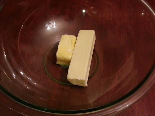 5. una vara y media de mantequilla o margarina. Me gusta usar un palo entero de mantequilla y la mitad de la margarina, pero este es realmente su elección. Mi madre siempre usa margarina todos, pero soy un amante empedernido de mantequilla.