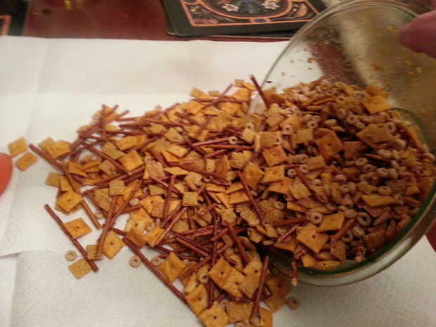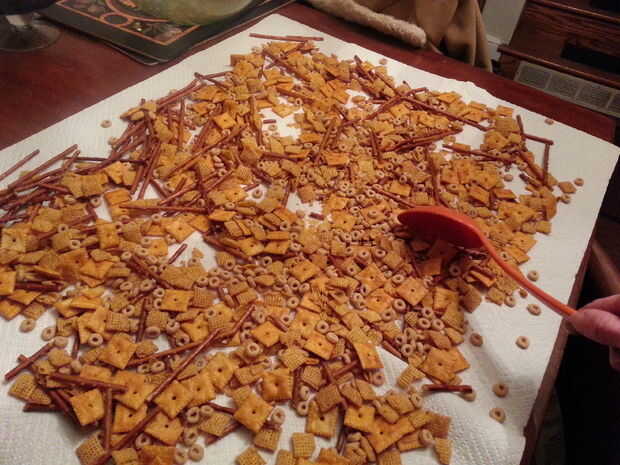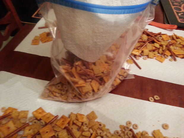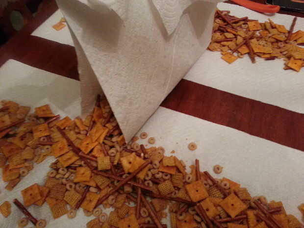 4. Vierta la mezcla cocida aperitivo en las toallas de papel, utilizando la cuchara mezcladora para difundir hacia fuera. Cuanto más se extienda la mezcla en las toallas, más rápido se enfriará.