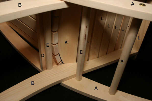 Los planes también incluyen cuadros y dimensiones de trineo cono que usar con mi sierra de mesa, para cortar los listones de la espalda y la espalda apoyan piezas. Dimensiones - 19 1/4" W x D 32" x 35 1/2" H (50cmW x 81cmD x 90cmH)