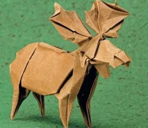 el alce es el miembro más grande de la vida de la familia de los ciervos y se distingue fácilmente por sus cornamentas distintivo. Esto era un modelo divertido y desafiante para el diseño, particularmente puesto que mi enfoque centrado en la simplicidad, del animal postura, actitud y carácter esencial en lugar de complejidad técnica. El diseño se unieron rápidamente como mi idea inicial resultada para ser una buena. El modelo también tiene la virtud de pie en cuatro patas sin querer inclinar hacia adelante o hebilla, ya que las patas se desarrollan de puntos en el centro del papel.