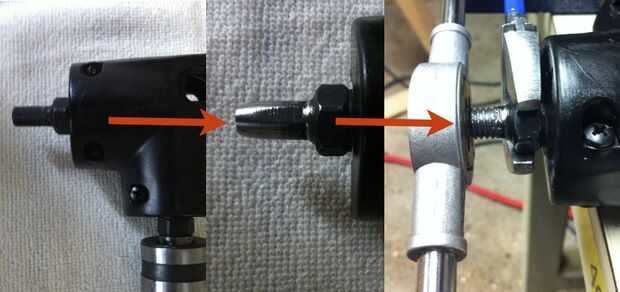 2. Utilice un dado de 3/8-16 para cortar roscas en el eje de entrada 90deg taladro. Usé un tornillo de llave para bloquear el eje de entrada mientras hilos de corte. Threading consejos: