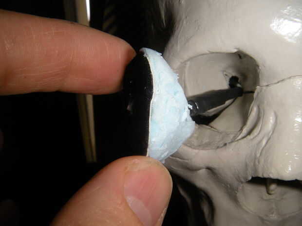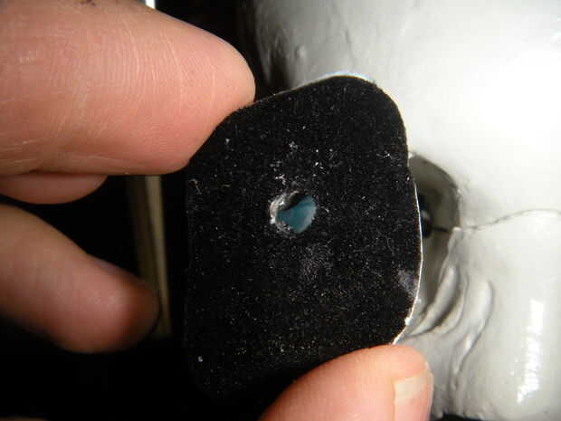 Una vez cargado el bosquejo, el audio del protector de la onda debe ir directamente a la entrada de audio "" entrada, dentro del cráneo. El enchufe de audio desde el amplificador debe ir el audio "out" entrada dentro del cráneo. Se desea que el volumen en el protector de la onda dada vuelto hacia arriba, pero se puede ajustar el amplificador al volumen que mejor le convenga. Hice algunos ajustes para el kit de cráneo para visualizar. El kit viene con LEDs, que iluminan con el sonido de los ojos. No pensé que tenía suficiente contraste, así que corte un poco de espuma aislante para los zócalos del ojo. Luego había pegado un papel negro para el área expuesta de la espuma y había instalado los LEDs en la espuma.