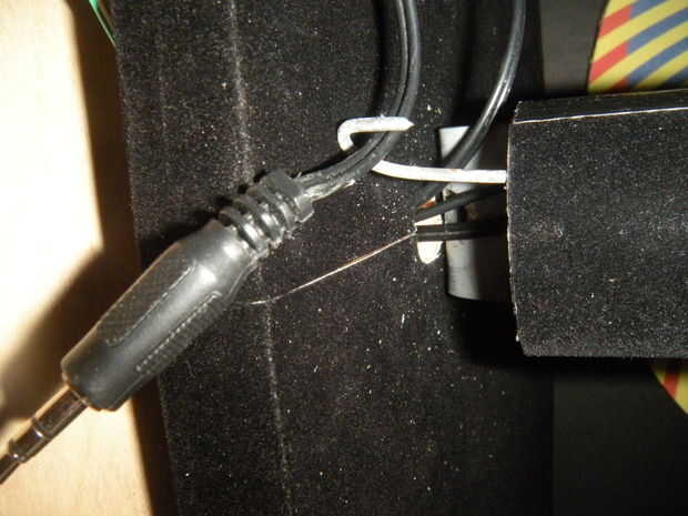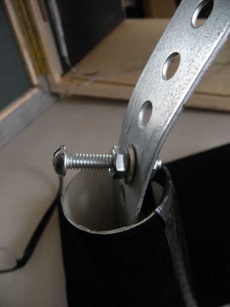 Perfore un agujero lo suficientemente grande como para adaptarse a los extremos a todos su poder y cables de audio en la base del soporte. Desea el tubo para poder ocultar esto. Nota: este agujero debe ser lo suficientemente grande para rellenar los cables, mientras que el también tiene otros cables que lo atraviesa. Monte el soporte mediante arandelas y tornillos grandes o los pernos. Usé un trozo rígido de alambre para pescado todos los cables por el orificio y el tubo.