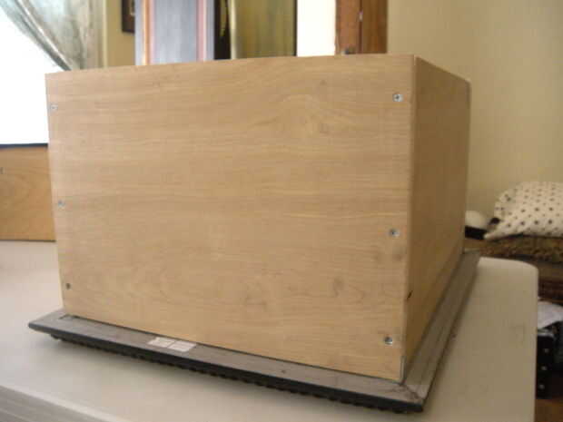 Una vez construido el cuadro, había forrado el interior de la caja con papel negro en todos los lados excepto en la parte inferior. Fuzzy, se reunieron obras de papel mejor, pero papel de construcción negro ordinario será fina, o incluso pintar el interior de la caja. Corté una pieza de contrachapado que cabe justo en la parte inferior de la caja cuando estaba parado vertical. Esto es a montar el soporte que sostiene el cráneo.