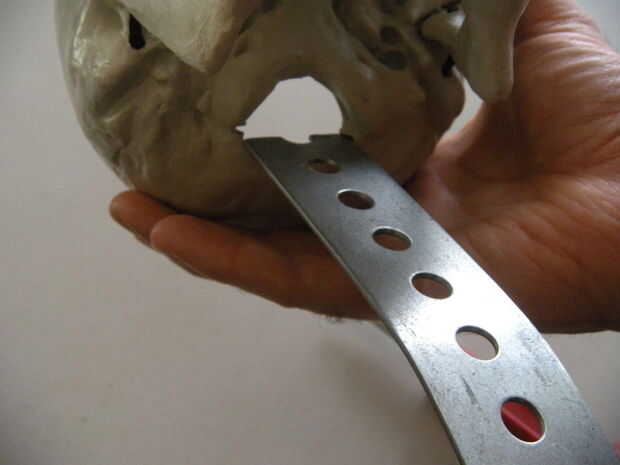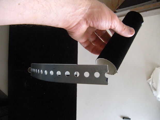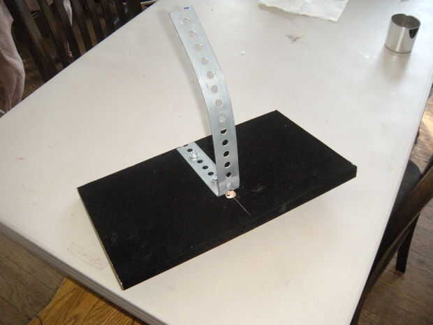 Usé stock de acero plano de soporte para el soporte. Después de decidir aproximadamente cuánto deseaba el cráneo, corte y doblado el soporte por lo tanto, asegurándose de permitir suficiente superficie montar firmemente al cráneo. Una vez que había doblado el soporte, montara el cráneo en él. En mi caso, corté dos pequeñas muescas en el agujero en la base del cráneo, que eran lo suficientemente grandes para insertar el soporte. También he añadido un tornillo para el cráneo en. Ahora armar todo el conjunto y alinéelo en el cuadro, confirmando que el cráneo es donde usted lo desee. Confirmar la curva está en el lugar correcto y que el cráneo tiene suficiente espacio libre en el frente y la espalda, ya que no desea que el disco hace girar frotando contra la calavera o cráneo tocar el vidrio. Marcar donde quieres tus agujeros para el soporte y todo lo eliminar por lo que se pueden taladrar los agujeros piloto en la base. Retirar todo el soporte temporalmente y hacer los ajustes necesarios en el soporte. Una vez que tienes el perfecto soporte, calentar el soporte con una antorcha de plomería hasta que está al rojo vivo. Luego colóquelo en una bandeja de agua para enfriarla rápidamente. Esto se establece su curva y que sea elástico y rígido. Cubrir la base de madera contrachapada con el papel negro y cortar los agujeros piloto con un cuchillo.