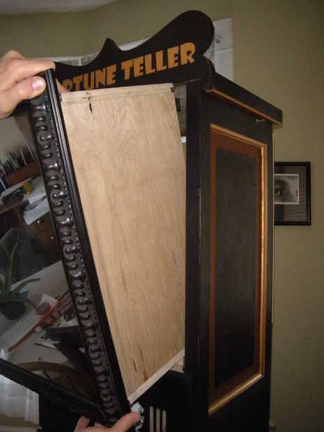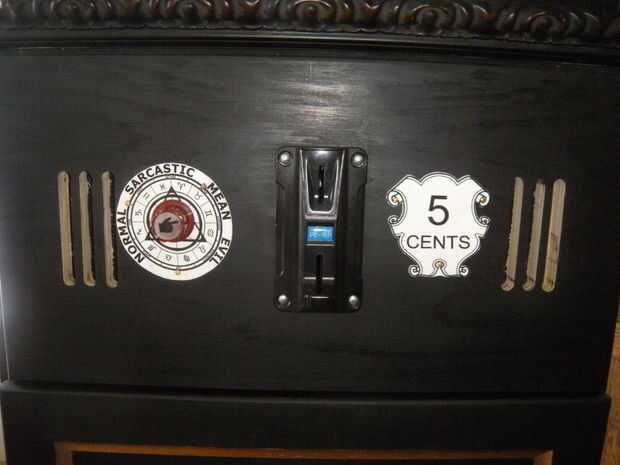 La parte frontal tiene la perilla, la ranura para moneda op y las rejillas de los altavoces. Encamina las ranuras en la madera contrachapada y montado los altavoces detrás de ellos. Quería allí cierta profundidad a la placa, así que había copiado mis diseños (medidor de humor 5 centavos de dólar) a algún plástico del encogimiento y había contraído hacia abajo. Luego se une a la unidad con tornillos. Encogimiento plástico se reduce hasta un tercio de su tamaño, así que calcular por lo tanto si utiliza este método.