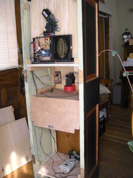 Ya que iba a hacer esta fichas, necesitaba un compartimiento que sea fácilmente accesible. Hice tres estantes que eran del mismo tamaño: una para la caja para sentarse y que la parte superior del compartimiento, uno para la parte inferior del compartimiento y un estante para la parte inferior que también ayuda a estabilizar el conjunto del proyecto. Os adjunto también una puerta con bisagras para el estante del medio. Este será el punto de acceso para recoger las monedas. También pude instalar una cerradura en la puerta, que es sólo una simple cerradura que pones una llave y se convierte. Una tira pequeña de metal se desliza en una ranura y mantiene el compartimento todo bloqueado.