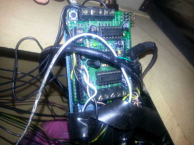 The Moose usé tenía dos motores, en que controla la boca y el segundo controla el movimiento de lado a lado (tipo de baile) no el alces. Todo lo que necesitas hacer es cortar los cables que conectan al controlador y conectan al blindaje del motor. Probablemente no importa cual cable conectar a tierra y alimentación, a pesar de que va a cambiar su esquema. Conecté mi motores M1 y M2. También conecté una fuente de alimentación de 9v a poser en coche a los motores. El escudo del motor viene con un dibujo de ejemplo (MotorParty) para conducir los motores. Probar para comprobar que puede mover los motores como usted quisiera. Aquí están las partes importantes: