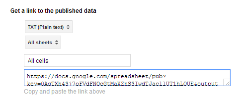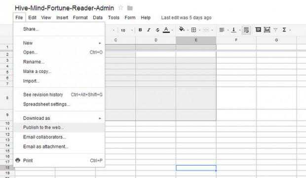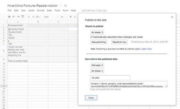 La belleza real de Google spreadsheets es que puede hacerlos accesibles como los datos muy fácilmente sin ninguna autenticación o claves de API. Para ello usted sólo publica a la web. Obviamente esto no es algo que puedes hacer para los datos sensibles, por lo que no debe usar la hoja de cálculo para almacenar su OAUTH twitter claves (que serían bien chunga!)
