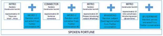 fortuneSpoken = "Hello. "+tfUserCurrent+". "+adminSettings[7]+ ". "+fortuneGreeting +". Here. you are. Your Psychic Hive Mind. Fortune. based on reading .the collective mind of. "+queryString+". is. "+fraglet1+". "+ fortuneWord1+". "+ fraglet2+". "+fortuneWord2+". "+fraglet3+". hashtag."+fortuneHash+ ". "+fraglet4+". Twitter user."+fortuneUser+". Thank you. I have tweeted a psychic summary of this reading to your twitter account. Moove along now. " ;