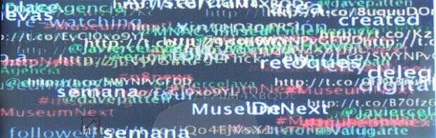 Ejemplo de Jer tiene un simple texto blanco sobre negro y obras cálculo del tamaño de la pantalla, y luego poner al azar el texto dentro de esos límites. Jugaba con este código. Tenía no uno, sino cuatro subconjuntos de tipos de datos: palabras, hashtags, usuarios y URLs.