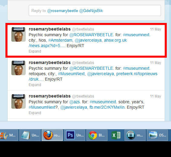 El cerebro psíquico es realmente una aplicación de Twitter. La cuenta utilizada para registrar la aplicación de Twitter (Rosemarybeetle Lab) también envía un tweet Resumen con los dos términos al azar, hashtag y nombre de usuario, pero también un enlace al azar de la discusión. Aunque bien tweet, URLs no están incluidas en la fortuna hablada completa leyendo, porque generalmente las direcciones URL son ininteligibles cuando hablado por los motores de texto a voz!