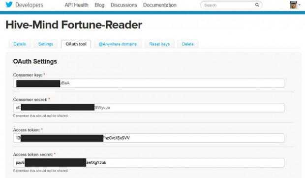 Obviamente obtener tweets, necesita conectarse a Twitter y para ello, utiliza una cuenta de Twitter dedicada (esta cuenta se utiliza para registrar el adivino como una aplicación oficial de Twitter. Esto le permite conectarse a Twitter usando las claves de autenticación abierta y que la API necesarias para extraer los tweets para el procesamiento de las consultas de búsqueda.
