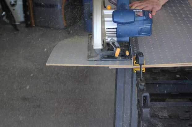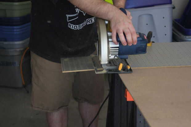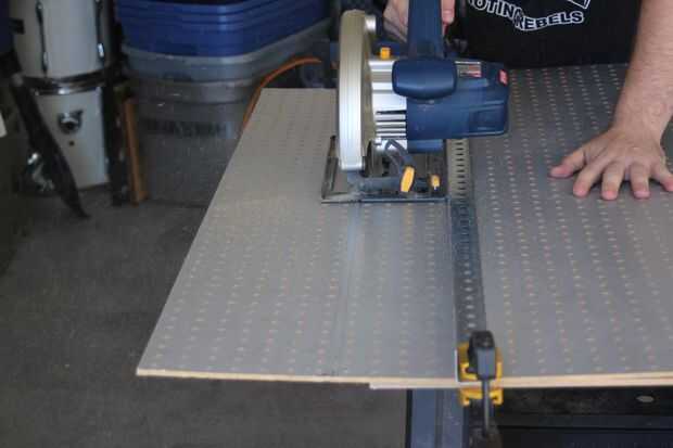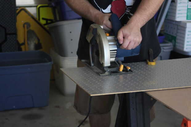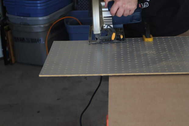 Después de medir y marcar el pegboard, arrancó a la altura correcta y luego en tres pedazos.  Usé una sierra circular.  Estos son peligrosos, tenga cuidado, lea todas las instrucciones y use gafas de seguridad.