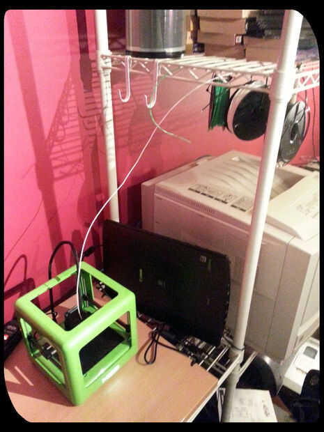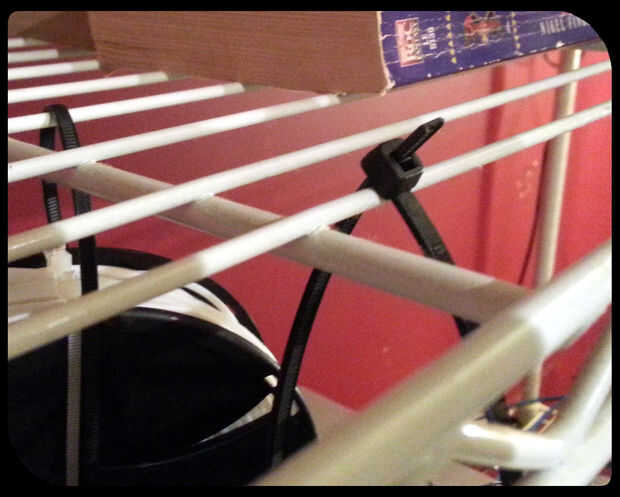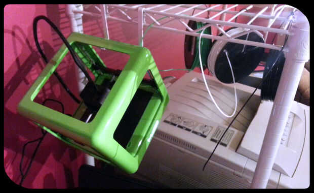 Tomar los extremos abiertos de la brida y rosca alrededor de un alambre en la estantería de alambre. Recorte cualquier exceso. El carrete debe colgar gratis sin demasiada holgura en los vínculos para movimiento lateral. Enrosque el extremo de los cables V-como en el extremo de la plataforma. Esto evitará que filamentos diferentes carretes de travesía. Como se puede ver en la imagen, la impresora y carretes de colgar cuando no esté en uso, y cuando esté en uso, es un asunto sencillo para tirar del filamento del final de plataforma hasta la impresora. La impresora utiliza filamento, rodará suavemente el carrete.