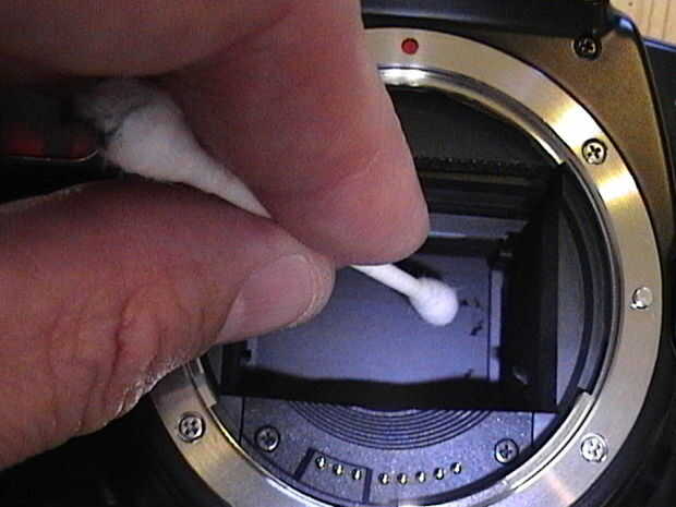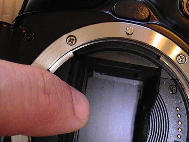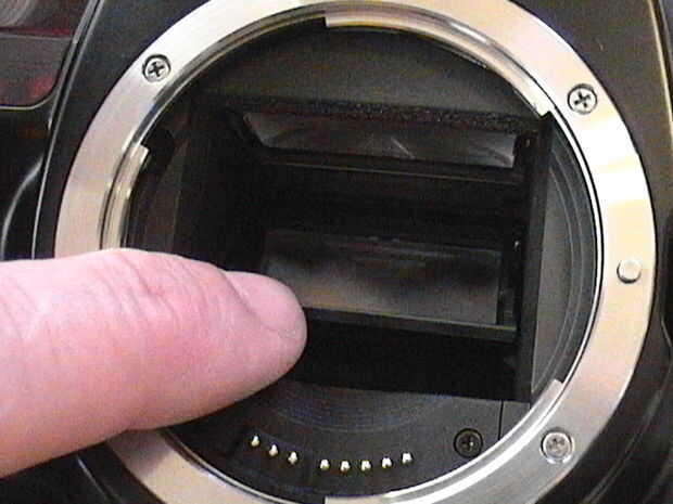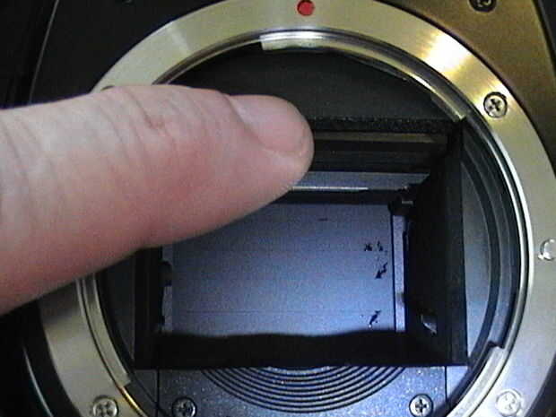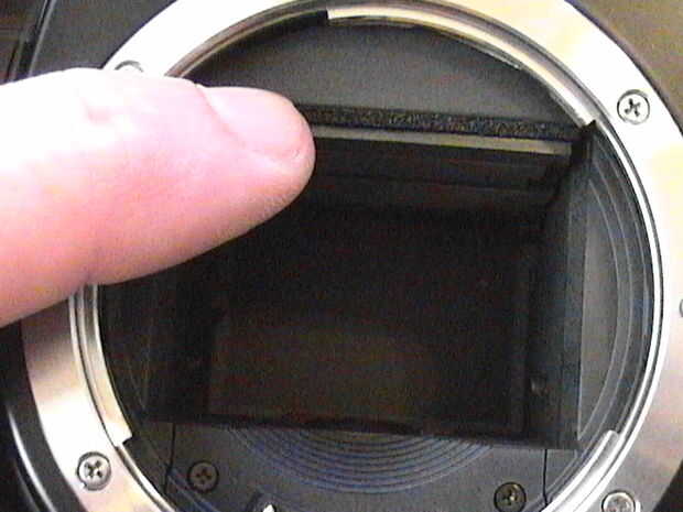 6. con un dedo, levante el espejo hasta que toque el parachoques de espuma en el pentaprisma.
