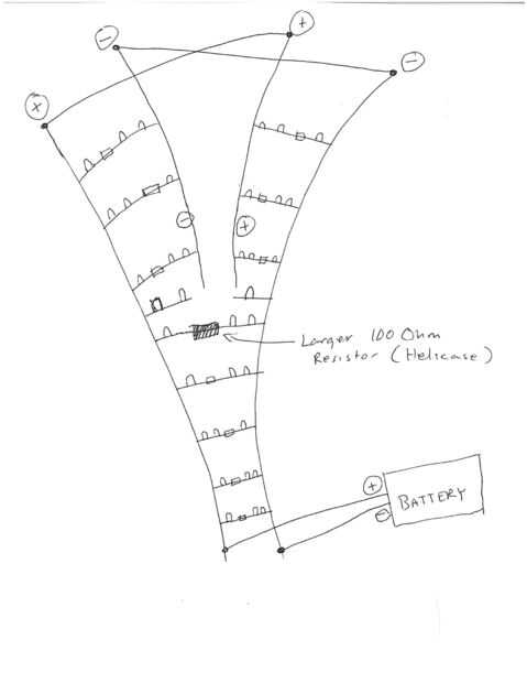 Después de haber construido cerca de 6 a 8 hilos subiendo usted querrá dividir el modelo en dos filamentos. Aquí es donde tienes que prestar mucha atención a lo que es positivo y negativo. Usted necesitará un par más pedazos de alambre de cobre grueso para el 'otro lado' de las piezas de la fractura. Es importante mirar el dibujo para ver dónde está el poder en este circuito. No quiere accidentalmente la batería + y - en el modelo. Sarah soldar dos piezas de cobre al puente exterior blanco + y - en el interior + y - de la fractura.