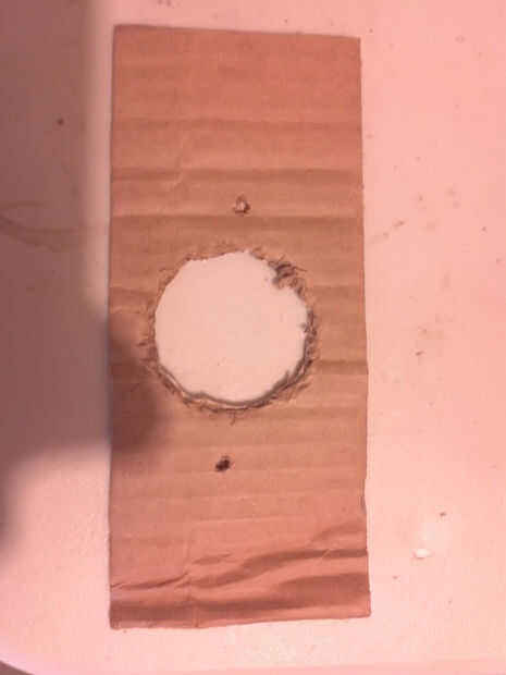 Con 1.5" Sierras de broca en el taladro; crear un agujero en el centro del material donde se marcó. Cambiar la Sierra de agujero con la broca y perforar un agujero en cada una de las otras marcas. Debe buscar su pieza acabada nada como esto. Esto fue hecha con las herramientas anteriores menos el taladro.