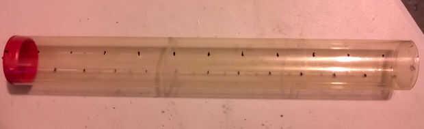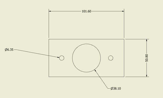 En primer lugar, coge la broca de 2 "x 4" (50 mm x 101 mm) plástico/madera/cartón/lo que sea. Utilizando un lápiz/marcador/delineador de ojos; Haga una marca en el centro de la pieza. Precisión no es realmente necesaria; puede globo ocular esto. Medir ~ 2"(50mm) de la marca que hizo y marque. Hacer esto otra vez en la dirección opuesta. Ahora debe tener tres marcas sobre el material. La marca es donde eventualmente se irá la barra guiadora 1.5"(38mm) de diámetro. Las dos marcas será donde se enroscará el alambre a través de.