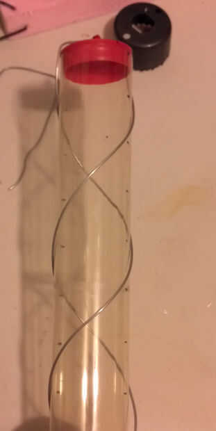 Coloque el alambre doblado sobre el extremo de la barra guía y pasarlo a través de la guía. Mueva a la guía de alambre a la parte superior de la varilla. Empezar a girar la wireguide ya bajar la guía. Como haces esto, compruebe el espaciamiento de sus vueltas para asegurarse de que son relativamente. Creo que usé una vuelta completa cada 2 pulgadas pero esto es realmente sólo una cuestión de preferencia. Si decide que desea más o menos vueltas, no olvide ajustar la longitud de su cable por consiguiente. Para realmente calcular la longitud necesaria, consulte la sección solución de problemas y el ajuste al final de este instructivo.