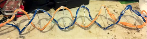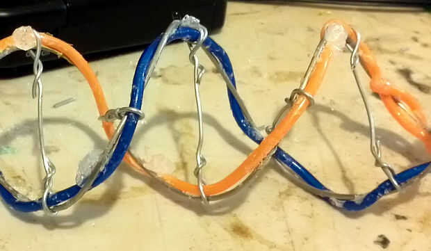 Para este paso necesitas el otro trozo de cable ni-cromo. Mida y corte una sección de ~ 2" de él. Encontrar un lugar cerca de la parte superior de la bobina. Lugar la sección ha cortado de tal manera tienen suficiente material en ambos extremos para envolver alrededor del alambre el alambre y el apoyo. Una vez que lo tienes colocado, envuelva sin embargo te gusta y recorte el exceso. El resto se realiza de la misma manera a lo largo de la pieza. La distancia entre los travesaños es lo que adapte a sus preferencias. Mina espaciados cada 90 grados para que si usted está buscando a través de la bobina desde arriba ves un rough más forma. Este proceso, además de proporcionar otros puntos para cristales a forma, ayuda a da la rigidez adicional de toda la estructura y se puede utilizar para modificar la forma de las bobinas si alguno es incorrecto.