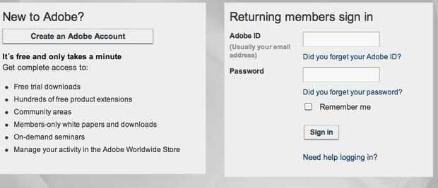 Nota: Si no tienes un ID de Adobe, haga clic en el enlace en la pantalla de bienvenida o en la barra de menús para crear uno.