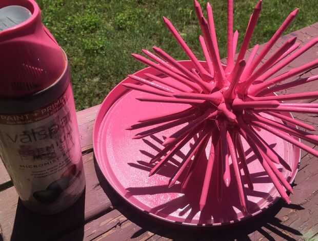 Coloque su criatura en la superficie de protección y darle una capa de color con la pintura en aerosol. Deje que esa capa seque luego lo voltee y rocíe el otro lado. Repita este paso hasta que todas las espinas son de color. Dejarlo totalmente seco antes de pasar al siguiente paso.