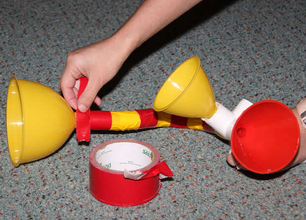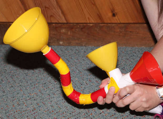 El que está en Whoville son conocidos por tener una gran cantidad de instrumentos salvaje y locos. En "Horton Hears A Who", el que tiene que hacer mucho ruido para que amigos de Horton pueden oír y creer que realmente existen. Hemos querido incluir estas que-trompetas con los disfraces. Nos dimos cuenta que estos instrumentos tienen diversas formas de instrumentos típicos. Tienen muchas piezas de bell, que es la parte de trompeta donde los sonidos sale, en vez de uno como una trompeta normal. Para hacer esto, hemos comprado algunos pedazos de tubo de PVC. Nunca habíamos trabajado con esto antes, pero resultó ser bastante fácil. Compramos piezas que llamaron R trampas, que fueron alrededor de un pie de largo y tenía una forma interesante de curvas, para ser la parte principal de los instrumentos. Entonces utilizamos diferentes tuberías que atornillan fácilmente en los extremos, y de esa manera los extremos tenían más de una apertura. En algunos de ellos nos une conexiones con dos aberturas y algunos con tres. También tenemos embudos en rojo y amarillo, en diferentes tamaños. Utilizamos el pegamento caliente para fijar los embudos en el extremo de las conexiones, dejando una abierta en cada zona que estallaría en. Luego cubrimos el tubo de PVC blanco con tiras de cinta de color para darles a un Seuss rayas como mirada.