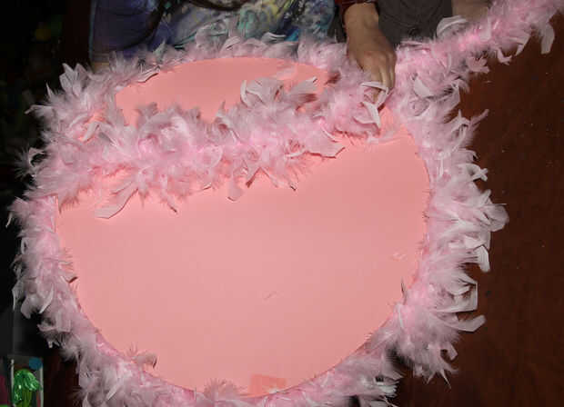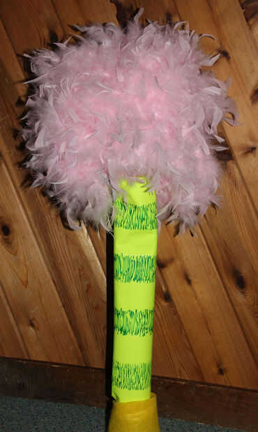En "Horton Hears a Who", que es son una mota de polvo a los ojos de Horton, y él coge el polvo en un trébol. Hemos decidido incluir algunos de estos tréboles en el fondo de nuestra foto. Para los tallos de los tréboles, se utilizó cartulina amarillo fluorescente. Cortar en una tira gruesa y agregar rayas, usando un marcador permanente verde para hacer áspera líneas como Dr. Seuss utiliza. Laminado en frío de cada uno para formar un tubo y pegado cerrado. Las flores color de rosa, usamos boas de pluma del color de rosa. Necesitábamos al menos dos boas de 6 pies para cada uno de ellos. Queríamos que algunos de los tréboles en el fondo y algunos de los perros para sentarse. Para los que estaba solo, cubrimos una pelota de playa con las boas, los pegar encendido con pegamento caliente hasta que estaba completamente cubierta. Entonces nos pega la bola en la parte superior del tubo. También hicimos una base para ellos usando un recipiente de plástico, que cortar un agujero y cubierto con fieltro amarillo. Para los tréboles de perro, hicimos un gran círculo de cartulina rosa, asegurándose de que era lo suficientemente grande para un perro para sentarse. Entonces nos pega una tira fina de cartulina, alrededor de 4" de ancho, a lo largo del borde del círculo. Luego cubrimos ese círculo con las boas de la misma manera. Entonces fuimos capaces de utilizar ese círculo para cubrir una pequeña caja de madera para los perros a sentarse, por lo que parecían que estaban sentados en un trébol.
