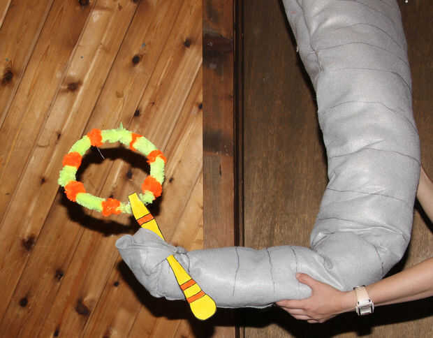 Desde que son tan diminutos, Horton sería gigantesco al lado de ellos. Vimos que Dr. Seuss a veces representada sólo la parte inferior de su tronco cerca de ellos, así que decidimos hacerlo. Para hacer el tronco, cortamos un pedazo grande grueso de gris fieltro en ángulo, para que era más ancho en la parte superior y progresivamente más angosta hacia la punta. Luego nos pegan alambre grueso en tiras bajando el fieltro en algunos puntos. Luego se utilizó el arma de pegamento para formar en un tronco de tubo como forma y pegamento se cerró. Luego rellena para darle forma, con un montón de relleno. También nos basamos en las líneas con un marcador gris oscuro, para indicar las arrugas en el tronco de un elefante. Puesto que el tronco tenía alambre dentro, entonces fuimos capaces de doblar en diferentes formas, hasta que nos pareció más como la trompa de un elefante. Para la lupa, realizamos la parte superior de los vástagos del chenille jumbo. Trenzados entre sí una naranja brillante y un amarillo brillante y había formado en un círculo. Luego dibujó una manija en cartulina y pintado, agregando un palito en la parte trasera para ayudar a mantener su forma. Luego pegan la lupa y había atado al tronco.