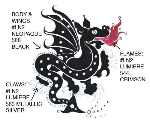 7. pinte la llama procedente de la boca de dragón de #LN2 Lumiere tela pintura en 544 carmesí. Pintura de las garras del dragón con #LN2 Lumiere tela pintura metálica de plata de 563. Que todos los colores de la pintura seca y heatset con una plancha.