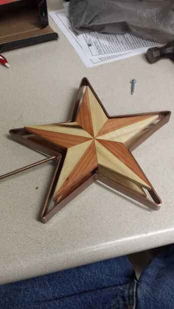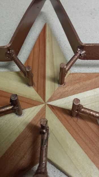 A acabado de completar el proyecto centra la estrella detrás de madera en el centro de la estrella de metal. Para transferir las posiciones de los soportes ligeramente un martillo para hacer una pequeña marca en la madera. Lo hice para la delantera estrella así. Uso de las marcas pequeñas perforé un orificio de 3/16" medio camino a través de la madera.