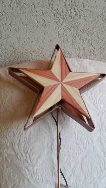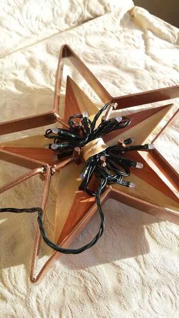 Pegué la espalda estrella en mezclar algunos epoxy primer y untar un poco en cada uno de los agujeros. Asegúrese de que la estrella de madera es agradable e incluso con la estrella de metal y luego dejar la curación. Después de que la estrella de la espalda se cura es hora de colocar las luces del LED. Usé una hebra de luz de LED blanco frío 15 que es alimentado por batería. Luché en cómo yo les pondría y paquete con una banda elástica y colocarlos libremente en el medio y el sándwich con el frente la estrella pegando al igual que la estrella de la espalda.