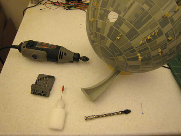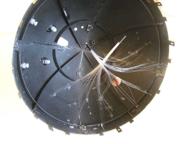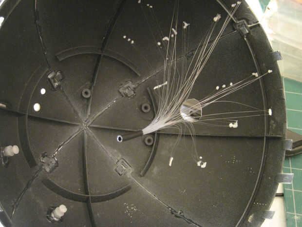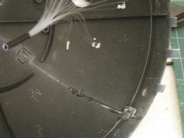 Inserte las fibras en los agujeros que perforó antes. Pegar con cola blanca. No use pegamento o cemento plástico como hacen derretir o que sea frágil. Epoxy podría funcionar mejor, pero no. Si se desea mantener en su lugar use un pequeño trozo de cinta adhesiva en el exterior del modelo para mantenerlo (hacen ellos parecen banderitas). Después el pegamento se seca en el corte las fibras con una cuchilla exacto.