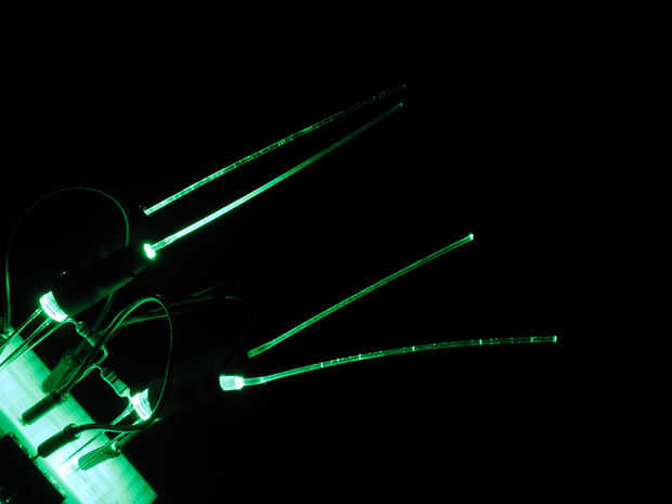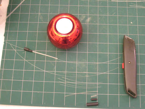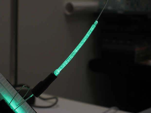 Empecé con distintas formas de tratar la fibra para las vigas mini recrear el look roto o diferentes. Terminé con una navaja a nick la fibra para crear puntos calientes en el mismo. También decidí agruparlos cuatro juntos y tubo del encogimiento clara para mantenerlos juntos. También decidí añadir una pieza larga a cada uno de los paquetes que no fue mellada por la viga principal. Entonces se atribuyo el LED verde en la parte inferior del paquete con tubería del encogimiento del más. Asegúrese de que dejar suficiente holgura en ambos extremos de la pieza larga para conectar la fuente de luz. Me ha podido hacer esto en mi primer camino y tuvo que rehacer todo de ellos.