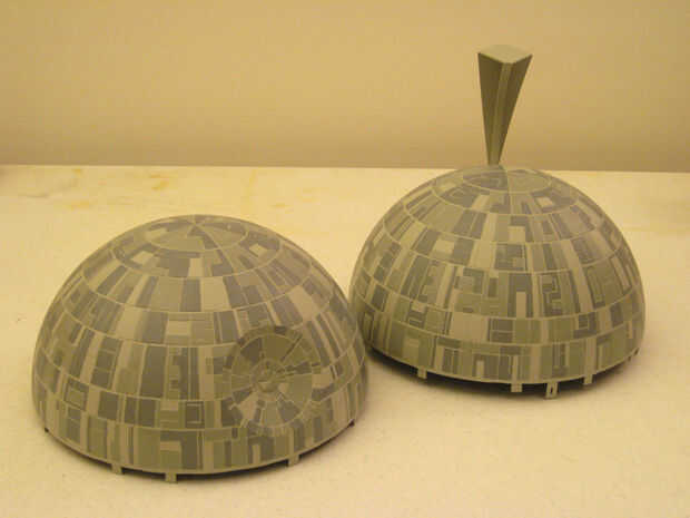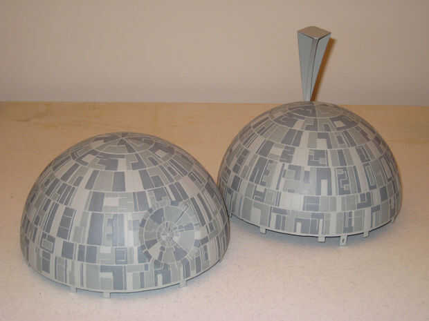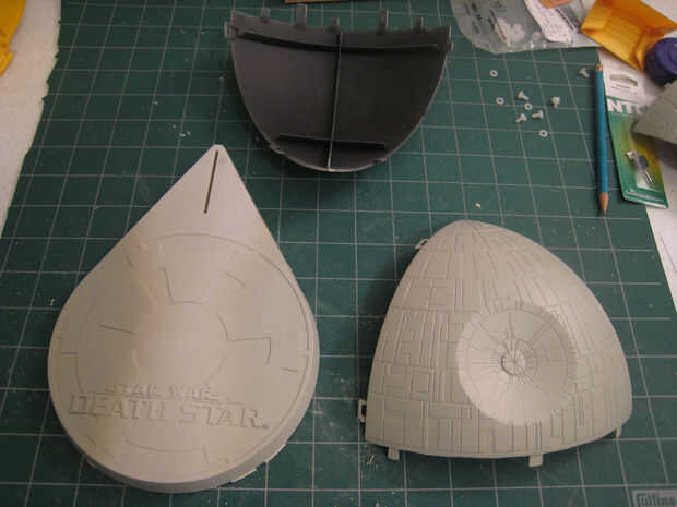 Para el montaje estrella de la muerte en el árbol de corte dos ranuras en el brazo que actúa como soporte. También recortar el plástico pedazos de la parte inferior. Este brazo será lo que se monta en el árbol con zipties. Pegar el brazo a la parte inferior la mitad del modelo.
